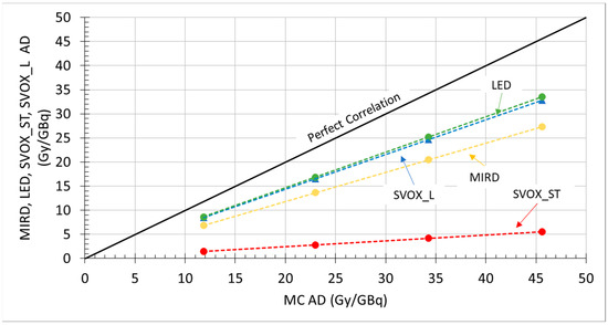 Correlation plot of the lungs’ , obtained from MC simulations with the Reference phantom (x-axis) with those from: mono-compartmental MIRD approach (MIRD), local energy deposition (LED), SVOX with ST kernel with corrections for tissue heterogeneities according to Equation (3) (SVOX_L), or without these corrections (SVOX_ST). For the SVOX_ST data, a previously published VSV kernel for soft tissue (ST) was used [26] (data freely available on the website https://www.medphys.it/down_svoxel.htm, accessed on 24 July 2024). For each dataset, each point in the plot is associated with an increasing LS value (10%, 20%, 30%, and 40%), and a line representing the linear interpolation of each dataset serves as a qualitative eye guide only.