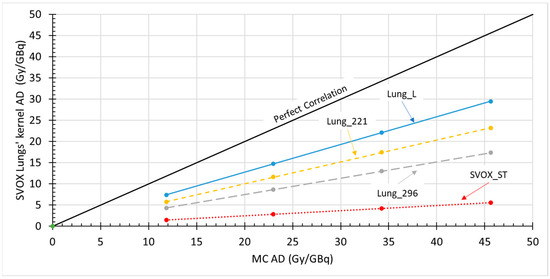 The SVOX method, using the lung VSV kernel, was employed to calculate the AD to the lungs after cropping the activity map to include only the lung region. Cropping was necessary because applying the SVOX method to the entire activity map would otherwise result in anomalous dosimetric contributions from the liver (as discussed in Section 3.2). The results obtained with the new kernel (referred to as Lung_296), those globally rescaled to the mean density of the Reference phantom’s lungs (referred to as Lung_221), and those locally rescaled for the tissue heterogeneities (referred to as Lung_L, according to Equation (3) and using the ICRU lung density as uniform tissue density), are shown on the y-axis of the correlation plot in Figure 5, similar to the results presented in Figure 4. For comparison, the SVOX_ST data are also included.