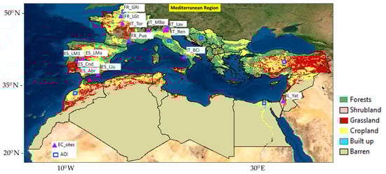The figure shows the study area, locations of seven AOIs colored in blue capturing major land use types of Mediterranean countries, and locations of eddy covariance sites in purple from where ground ET is retrieved for validating the results.