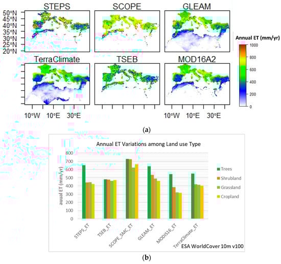 (a) Total ET estimated from observed models [TSEB, SCOPE, STEPS] and reference products [GLEAM, MOD16, TerraClimate] over the Mediterranean region with their aggregated sum over major land cover types (b). Uncertainty is expected from the use of high-resolution land cover data (ESA—100 m WorldCover) for comparison.