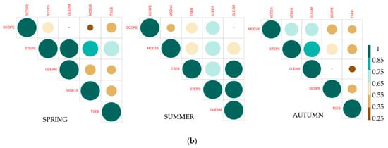 (a) Seasonal evapotranspiration (ET) sums for the period March to November 2019 from STEPS, SCOPE, TSEB, MOD16A2, and GLEAM (b) refer to their corresponding correlation matrix. The highest correlations were observed between STEPS and GLEAM in spring and summer with TSEB in summer, and STEPS and GLEAM in autumn. Conversely, the lowest correlations were found in the case of SCOPE with other products. Seasonal demarcations for this comparison adhere to reference [].