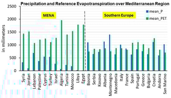Hourly potential evapotranspiration (PET), a derived dataset from the ASCE’s standardized reference ET model is used for countrywide atmospheric energy demand comparisons. Zonal statistics were applied to calculate the average precipitation (influx) and PET (outflux) for each country over a year. Figure 4 highlights the hydro-climatic disparities for the year 2019 in the Mediterranean countries. Precipitation is surplus in some countries (e.g., Montenegro, Bosnia, Albania, Italy, and Croatia) and deficits in others. This suggests favorable conditions for water availability, agriculture, and ecosystems in some southeast Mediterranean countries with precipitation surpluses. In contrast, the majority of Middle Eastern and North African (MENA) countries received less than 500 mm of annual rainfall, with the exceptions of Lebanon and Cyprus. Notably, Egypt is one of the driest countries, where PET reached above 1500 mm. In Egypt and other MENA countries (Libya, Tunisia, Algeria, Morocco) rainfall is low but evaporation demand is high, and agriculture is irrigation dependent. This makes water demand a dominant factor controlling water availability in the region. However, irrigation supplements the water deficit and allows agricultural activities to persist. The dependence on irrigation systems also highlights these regions’ fragility to changes in climate variability. Strong climate variability over southern Europe, Turkey, and the western Balkans has also been observed in recent years, affecting the water budget, and making their land use systems more vulnerable to water stress, which makes the two distinct climate clusters of hydrological imbalances more intense [], as shown in Figure 4 with a dotted borderline.