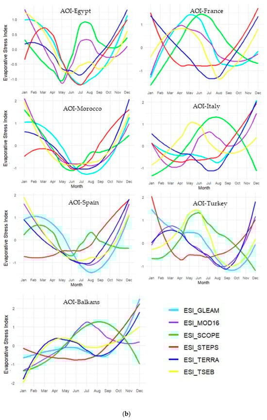 The Evaporative Stress Index (ESI) is employed to further assess how different ET products can influence the assessment of water stress (Figure 5b). An ESI value of −1.5 or lower indicates severe water stress, while +1.5 or higher suggests excessive soil moisture []. By comparing ESI derived from different models’ ET outputs, we observed variations in model performance over AOIs. For example, over croplands in Egypt, STEPS-GLEAM indicated water stress in June and July, whereas SCOPE-TSEB indicated earlier stress in May. It shows their effectiveness for irrigated croplands, assessing water demand earlier. Over grasslands in Spain, TSEB, MOD16A2, GLEAM, and TerraClimate showed a summer deficit, while STEPS and SCOPE did not, showing usability of the former over Spain. In the Balkan Forest, all models behaved entirely differently, making it challenging to decipher the uniform ET pattern of this region. The response of models over croplands in France was more consistent. STEPS, GLEAM, and TerraClimate, indicated similar trends, with only TerraClimate showing water stress in July, TSEB in August, and STEPS indicating stress throughout the summer. In contrast, all models agreed on water stress for croplands in Morocco during the same period, with SCOPE and TSEB again showing earlier stress as observed in Egypt. The overlapping responses by models in Morocco are likely due to the dominant role of high atmospheric demand and dry conditions. Ground ET measurements in Morocco would be valuable for verifying this uniform response by all models.