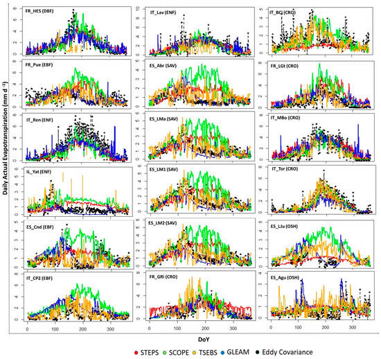 Daily time series of ET derived from models [STEPS, SCOPE, TSEB, GLEAM] and their comparison with daily observations from 18 eddy covariance sites presenting four ecosystems (forest, savannah, shrubland, and cropland) of the Mediterranean countries.