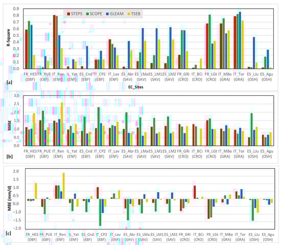 Displays plots of the r-square coefficient of determination, (a) root mean square error RMSE (b), and (c) mean bias error (MBE) of all models [STEPS, SCOPE, TSEB, and GLEAM] explaining the relative performance of these models in Mediterranean ecosystems.