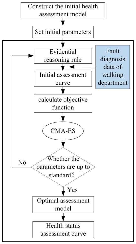 The running gear’s health status is evaluated using the established indicator system and collected fault data. The fault data are fed into the ER model, and the model parameters are optimized using the CMA-ES algorithm. The final outcomes are illustrated in Figure 4.
