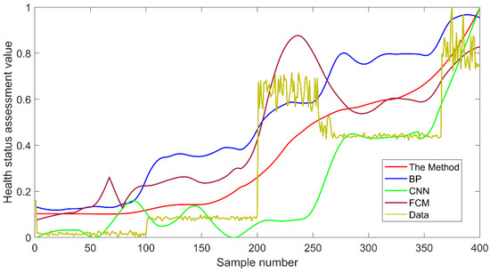 As shown in Table 3, the proposed method demonstrates superior accuracy in the health assessment of high-speed train running gear, with a mean squared error (MSE) of 0.0219, significantly outperforming the other three methods: BPNN, CNN, and FCM. This indicates that the proposed method provides more accurate and reliable predictions of the running gear’s health status. In contrast, the FCM method exhibits the highest MSE, indicating poor performance and insufficient predictive accuracy in this application. Although the BPNN and CNN methods perform relatively well, their accuracy is still inferior to that of the proposed method. Therefore, the proposed method offers a clear advantage in this field, making it a more precise and effective tool for the health assessment of running gear systems.