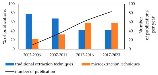 Evolution of the number of publications (%) concerning the determination of UV filters in environmental water samples (2002–2023) by using traditional extraction techniques and microextraction techniques (188 articles on the determination of UV filters in water samples).