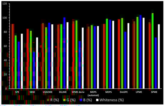 The highest whiteness rating (Table 2, Figure 2) of 100% was awarded to SDME, with only the red principle rated at less than 100 points. Assuming that the authors of this paper consider a result of more than 90% to indicate the whiteness of the method, six out of nine microextraction methods achieved satisfactory results. However, the lowest whiteness ratings were received by SBSE (72.3%) and SPE (77.5%), for which the blue principles had the greatest impact on the assessment.