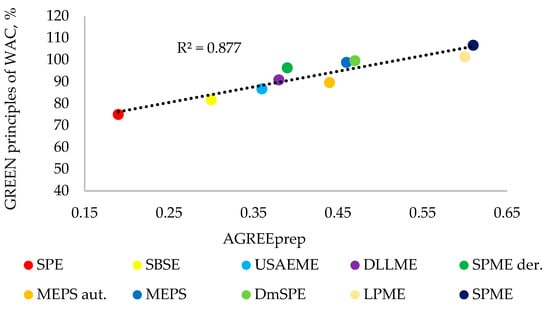 Linear correlation between the AGREEprep and GREEN principles of WAC.