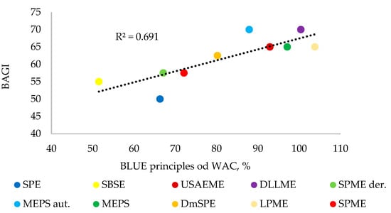 The BAGI tool is used to assess the suitability of an analytical method. However, the RGB 12 algorithm includes the blue principle (practical side), which is one of the components of the total whiteness assessment of the method. The correlation between the results obtained using the BAGI and the blue principle tools is shown in Figure 4. Despite a moderate correlation (R2 ~ 0.7), there was some agreement between both assessments. The four highest-rated methods for suitability by both tools are DLLME, SDME, MEPS, and USAEME. These methods obtained results for BAGI > 60 points, and for the blue principles > 90%. However, the SPME, SBSE, and SPE methods were rated the lowest by both tools. As can be seen in Figure 4, a greater discrepancy in both assessments can be seen for two methods: SPE and MEPS (fully automated). In the case of the SPE method, the BAGI rating is low (50), which is influenced by principle 8 (preconcentration), which lowers the rating for methods that use additional concentration steps (solvent evaporation). However, in the case of the MEPS (fully automated) method, the blue rating in relation to BAGI is lowered by additional parameters assessed in the blue metric tool, i.e., B1 (total cost) and B4 (portability).