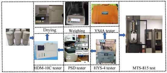 The specific test process includes the P-wave velocities test, the drying test, the vacuum saturation test, the F–T cycles test, the PSD test, and the UCS test. The test procedure is illustrated in Figure 2. The specific steps are as follows: