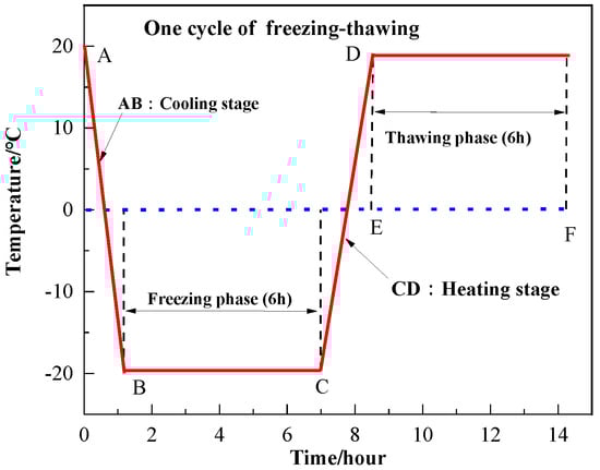 - The samples were maintained at the HDM-10C tester for the F–T cycles test. One cycle of the F–T experimental process is shown in Figure 3. The F–T cycles consisted of 0, 10, 20, 30, 40 and 50, respectively [35]. Following the F–T cycles test, the above steps were repeated by monitoring the P-wave velocity and the PSD.