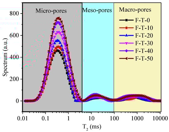 The change in the T2 spectrum can reflect the change in the pore structure in the rock. The rock structure and moisture analysis test equipmentdetects the relaxation response of the 1H proton via the CPMG pulse sequence test in the samples, and then the amplitude of the attenuation signal of the spin echo string is obtained. The set of all attenuation amplitude results forms the T2 spectrum [85]. Due to the porous media properties of the concrete, there is no unified criterion for the classification of pore size at present. As can be observed in Figure 4, the T2 distribution of the samples can be mainly divided into three peaks, corresponding to the transverse relaxation time T2 spectrum of the micropores (0.01~4 ms), mesopores (4~100 ms), and macropores (100~10,000 ms), as shown from left to right [86,87,88,89].