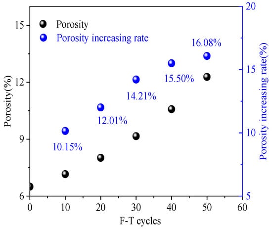 The test results and the calculation of porosity are shown in Figure 5. With the increase in the number of F–T cycles, the change in the porosity of the samples was positively correlated with the F–T cycles. The porosity of the samples after 10 F–T cycles increased by 10.15% compared with that of the samples without exposure to the F–T cycles. The porosity of the samples after 20 F–T cycles increased by 12.01% compared with that after 10 F–T cycles; the porosity of the samples after 30 F–T cycles increased by 14.21% compared with that after 20 F–T cycles; and the porosity of the samples after 40 F–T cycles increased by 15.50% compared with that after 30 F–T cycles. The porosity of the samples after 50 F–T cycles increased by 16.08% compared with that after 40 F–T cycles. This indicates that the pore structure damage of the samples after numerous F–T cycles was significant more serious than that causes by the previous 10 F–T cycles. This is because the first 10 F–T cycles have little influence on the pore structure of the samples, but the F–T cycles caused a certain auxiliary effect on the development of the pore structure of the sample. With the increase in the number of F–T cycles, the number of newly generated pores continues to increase, gradually developing into mesopores and macropores, which develop continuously, expanding and connecting to form microcracks, causing a significant increasing in the porosity of the samples.