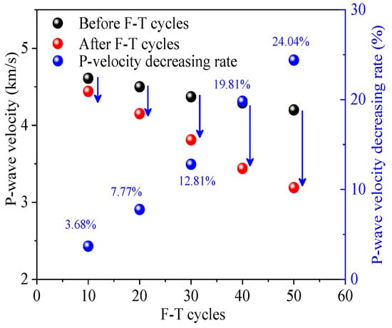 The changes in P-wave velocity, before and after F–T cycles, are presented in the Figure 6. The P-wave velocity of the samples decreases as the F–T cycles increase. The internal pores of the sample developed after 10 F–T cycles, and the P-wave velocity decreased from 4.61 km/s to 4.44 km/s, a decrease of 3.68%. After 20 F–T cycles, the P-wave velocity of the samples decreased from 4.5 km/s to 4.15 km/s, a decrease of 7.77%. After 30 F–T cycles, the P-wave velocity decreased from 4.37 km/s to 3.81 km/s, a decrease of 12.81%. With the increase in the number of F–T cycles, the pores continued to develop and began to connect, and the total number increased significantly. After 40 F–T cycles, the P-wave velocity of the samples decreased from 4.29 km/s to 3.44 km/s, a decrease of 19.81%, After 50 F–T cycles, the wave velocity of the samples decreased from 4.2 km/s to 3.19 km/s, a decrease of 24.04%.
