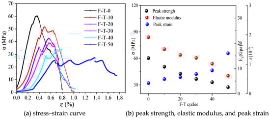 Stress–strain, peak strength, elastic modulus, and peak strain for the concrete sample under F–T cycles.