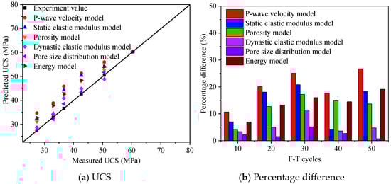 Figure 9 displays the experimental and predicted UCS values of the concrete samples subjected to various F–T cycles. As the number of the F–T cycles increased, the predicted values of the wave velocity model, the static and dynamic elastic modulus model, the porosity model, and the energy model were all greater than the experimental values. The largest discrepancies between the predicted and the experimental values after 30 cycles were 25.6%, 20.82%, 17.24%, 11.43%, and 16.03%. The experimental values of concrete prior to 40 F–T cycles were most closely aligned with the anticipated values of the pore size distribution damage model; the errors were 2.24%, 1.57%, 5.14%, and 2.70%, respectively. the pore size distribution model’s projected value and the experimental value showed the least amount of error after 50 cycles, and the error was 0.73%. Therefore, the pore size distribution damage model can accurately predict the mechanical strength of concrete samples after F–T cycles.