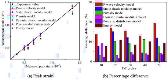 Comparison of predicted and experimental values of peak strain for the concrete samples subjected to different F–T cycles.
