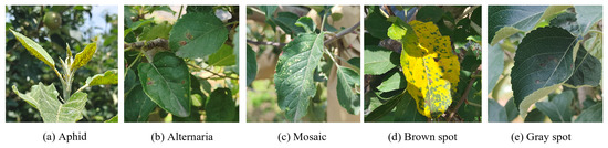 When diseases and pests occur in apple orchards, the traditional solution is that fruit growers inspect the orchard on foot or by vehicle, visually judge the types and degree of infection of diseases and pests on fruit trees, and take management measures to curb the development of diseases and pests and reduce the losses caused by them [5]. However, the manual judgment method is time-consuming and laborious and often limited by the height and shade of apple trees, resulting in a lack of sight and omission of diseases and insect pests and a wrong judgment of the type and severity of apple diseases and insect pests. Therefore, realizing fast and efficient diagnosis of apple pests and diseases is crucial to the sustainable development of the apple industry.