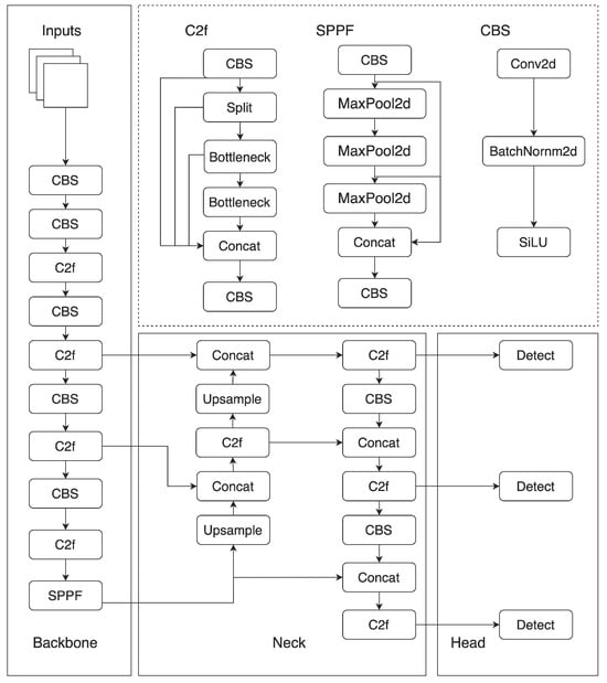 The YOLOv8n model consists of four core components: Inputs, Backbone, Neck, and Head, as illustrated in Figure 1. The Inputs component employs the Mosaic data augmentation technique, which adjusts certain hyperparameters dependent on the size of the model in use. This method effectively expands and enriches the dataset, consequently enhancing the model’s generalization proficiency and enabling it to maintain stable performance when confronted with various unknown or complex scenarios, ultimately bolstering the model’s robustness. In the Backbone and Neck components, the design approach of stacking multiple ELAN modules from YOLOv7 is referenced. The C3 module from YOLOv5 is modified to create the C2f structural module. While still maintaining a lightweight model, this significantly enhances the ability to capture gradient flow information and provides flexibility in adjusting the number of channels based on changes in model scale, resulting in a substantial improvement in model performance. In the Head component, compared to YOLOv5, the currently prevalent decoupled head structure is adopted. The model design separates the classification and detection heads, using two parallel branches to extract category feature information and location feature information, respectively. Then, it employs a 1 × 1 convolution layer for each branch to complete the classification and localization tasks, significantly diminishing the model’s parameter number, scale, and computational burden while enhancing its generalization ability and robustness.