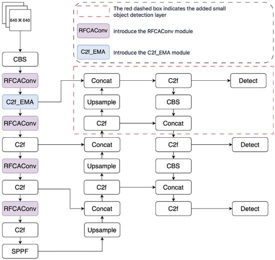 If the original three detection heads in the YOLOv8n network structure are still used for the detection task, the recognition accuracy for small targets will be excessively low. Therefore, a dedicated detection layer for small targets is incorporated into the original network structure. This layer performs 4× downsampling on the input image, significantly enhancing the extraction of shallow feature information and thereby improving the detection capabilities for small targets [16]. For small targets, this method has achieved a further improvement in accuracy. Additionally, in detection tasks where most targets are small [17], the original detection layer designed for large targets only increases the model’s parameter count and size. Therefore, this paper refines the detection process by pruning the layer originally designed for detecting large targets. The principal objective is to refine the detection criteria for small targets. The findings from the experimental studies, as depicted in Table 1, demonstrate that the effectiveness has been adequately proven. Although the increase in detection accuracy is most pronounced after adding the small target layer, the model’s parameter count only decreases slightly. After refining the small target layer, despite a slight decrease in detection accuracy, the model’s parameter count is reduced by 33%, achieving a lightweight improvement while enhancing accuracy.
