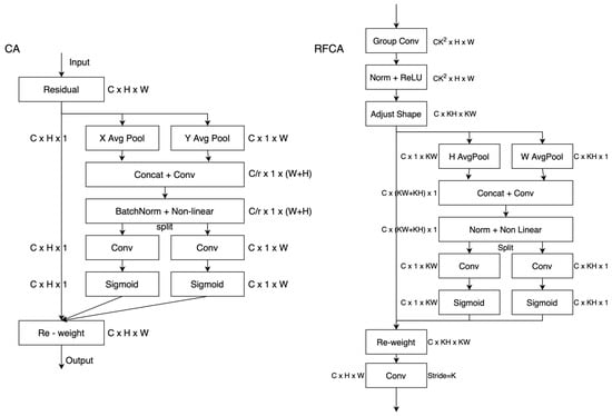 Receptive-Field Attention convolutional operation (RFAConv) [18] focuses on the spatial features information of the receptive field and addresses the issue of parameter sharing in convolutional kernels by introducing a receptive field attention mechanism. RFAConv ensures minimal computational overhead and parameter count, resulting in significant improvements in detection performance. Coordinate Attention (CA) is a mechanism that incorporates spatial location information into channel attention. By introducing CA’s spatial attention mechanism into the spatial features [19] of the receptive field, we obtain Receptive-Field Coordinate Attention (RFCA). The framework of the network is attractively portrayed in Figure 3, offering a clear visual representation. By matching the spatial attention of the receptive field’s spatial features with convolution, we generate the Receptive-Field Coordinate Attention convolutional operation (RFCAConv) to replace standard convolution, fully resolving the issue of convolutional parameter sharing. At the same time, it considers long-range information to some extent, enhancing convolutional performance. In the present study, RFCAConv is utilized to replace some of the standard convolutions in the backbone network, resulting in increased model performance.
