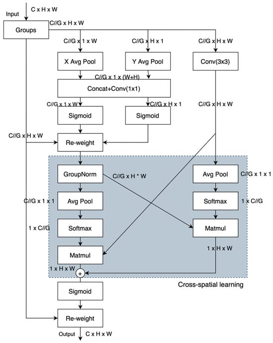 Introduce EMA, an efficient multi-scale attention module that operates without the requirement of dimension reduction. Its core mechanism is to smooth the attention distribution through the exponential moving average method, thereby improving the model’s robustness and generalization ability. This module recalibrates the channel weights in each parallel branch by encoding global information and captures pixel-level relationships [20] through cross-dimensional interactions. EMA is designed to reduce computational overhead while preserving key information from each channel, enhancing the model’s capability to process features effectively. By reorganizing the channel and batch dimensions [21] and leveraging cross-dimensional interactions, the model is able to effectively capture pixel-level relationships, which enables it to excel in focusing on important information within the image. Particularly noteworthy is the structure of the EMA attention mechanism module, as depicted in Figure 4.