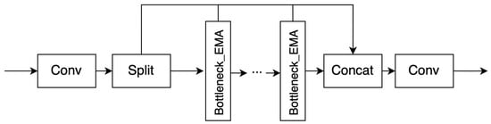 Within this article, the C2f_EMA module is used in the Backbone, and its architecture is illustrated in Figure 6. It exchanges the primary C2f module located in the core network. While maintaining the lightweight nature of the model, it enables the model to complete the learning of residual features, preserving feature continuity and information flow. For helmet-wearing detection on roads with complex traffic backgrounds and mostly small targets, the introduction of this module further elevates the perception of vital feature information, reduces the impact of noise interference, and improves detection accuracy.