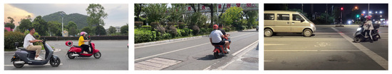 The experimental data were collected from multiple traffic intersections in the main urban area of Guilin. After screening, we obtained a total of 2126 image data, each with dimensions of pixels. We used the roboflow platform for data annotation, and the dataset mainly includes three types of targets: electric bicycle riders (E_bicycle), helmet-wearing targets (Helmet), and non-helmet-wearing targets (No_helmet). The collected dataset covers various conditions such as location differences, lighting variations, and shooting angles. Among these, conditions of illumination are a vital factor affecting the performance of target detection. If the dataset only includes images under specific lighting conditions during training, the model may not be able to adapt to other lighting conditions. Similarly, the background complexity in different scenes is high, and there may be significant appearance differences between targets in the same category. Therefore, constructing a dataset that includes multiple lighting conditions and different scenes is crucial for enhancing the versatility of the model and improving its generalization ability. Figure 7 presents a number of images drawn from the dataset.