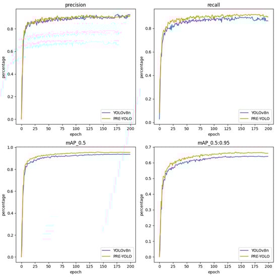 The empirical findings show that, when compared to YOLOv8n, following the enhancement of the small object detection layer, the model’s mAP@0.5 and mAP@0.5:0.95 both increased by 0.7%, while the number of parameters decreased by and the model size also reduced by 1.8 MB. Furthermore, when using RFCAConv to replace the standard convolution in the backbone, the mAP@0.5 and mAP@0.5:0.95 improved by 0.5% and 0.8%, respectively, compared to the original model. It is remarkable that following the simultaneous introduction of the small object detection layer and RFCAConv convolution, the model’s detection performance was further enhanced, with the improvement in mAP@0.5 and mAP@0.5:0.95 reaching 1.2% and 1.9%, respectively. In addition, the model’s parameter count and size still decreased. On this basis, the addition of C2f_EMA further strengthened the model’s capacity for feature perception, capturing more characteristic information, thereby further enhancing the model’s performance. Compared to the original YOLOv8n model, the improved model achieved an increase of 2.2% and 2.6% in mAP@0.5 and mAP@0.5:0.95, respectively, while the parameter count decreased by 33.3% and the model size was reduced by 1.8 MB. The ablation experiments comprehensively proved that the advanced algorithm proposed in this paper not only boosted detection accuracy but also notably decreased the model’s parameter count and size, achieving a comprehensive improvement in model performance. This enhancement effect is visually demonstrated in the comparison curve shown in Figure 8.