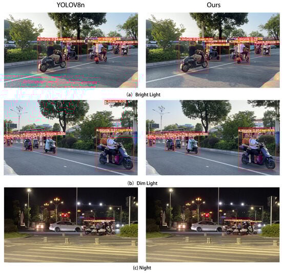 Based on the analysis of ablation experimental results, a comparison was made between the original YOLOv8n model and the algorithm studied in this paper for detecting electric bicycle riders on complex roads. To more intuitively showcase the detection performance of the two algorithms, selected images from different scenarios in the dataset, including bright light, dim light, and night, were tested, as shown in Figure 9. In scenarios (a), (b), and (c), the original YOLOv8n model suffered from issues such as missed detections, false detections, and difficulties in detecting overlapping targets for electric bicycle riders. In contrast, the refined model presented in this paper excelled in detection tasks under varying lighting and scene conditions.
