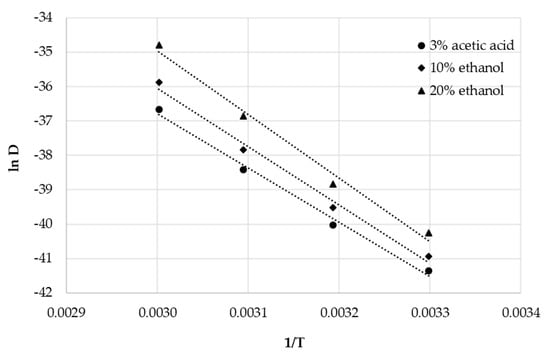 Correlation between the diffusion coefficients (DP) and the reciprocal temperature (Arrhenius plot).