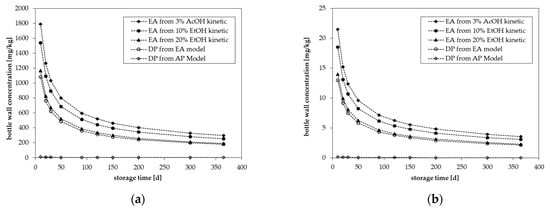 Regarding the new proposed threshold limit of 1 µg/L, maximum concentrations of 297 mg/kg (3% acetic acid), 255 mg/kg (10% ethanol), and 192 mg/kg (20% ethanol) in the PET bottle wall are predicted for 365 days of storage at 25 °C. Shorter storage times increase the above-mentioned maximum concentrations in the bottle wall. In addition to the storage conditions of up to 365 days at 25 °C, forced storage conditions of 10 days at 40 °C and 10 days at 60 °C were calculated. The forced contact conditions are used to accelerate the experimental migration testing and are part of the legal requirements according to Regulation 10/2011 [33]. Based on the experimentally determined activation energies (EA) for 20% ethanol, the test conditions of 10 d at 40 °C simulate storage for 195 days at 25 °C. In contrast, testing for 10 d at 60 °C very unrealistically simulates 18.3 years of storage at 25 °C. Similar results were obtained for 3% acetic acid at 100 days (10 days at 40 °C) and 7.2 years (10 days at 60 °C), respectively. The test conditions of 10 days at 40 °C are therefore much more suitable for real food applications than the current test conditions of 10 days at 60 °C in accordance with European Regulation 10/2011 [33]. The literature data for the acetaldehyde-scavenging additive anthranilamide [27] in PET bottles as well as for the polymerization catalyst antimony [28] confirm that 10 days at 40 °C are better testing conditions than 10 days at 60 °C.