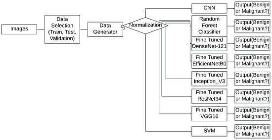 Figure 3 shows the flow chart of the different models that were used in this study. The images were loaded from the drive, after which they were split. A total of 83% were used for training, 10% for testing, and 7% for validation. However, there was a need for more training images to be generated. The image generator was used to produce additional images. Subsequently, a normalization technique was applied to ensure that every image was divided by 255 before being fed into the different models used to predict whether a skin lesion is benign or malignant.