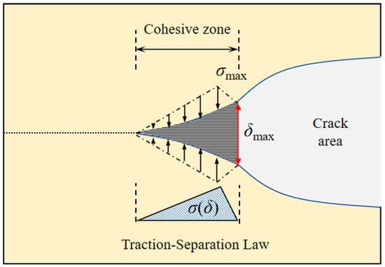 The cohesive force model is established on the basis of damage mechanics, assuming the existence of small-sized cohesive zones near the crack tip, within which micro-cracks initiate, propagate, and eventually coalesce, promoting crack tip advancement and eventually forming macroscopic cracks [25,26]. The cohesive force model does not fully simulate the actual physical cracking process but rather idealizes the crack tip as a region where cohesive forces prevent crack propagation, as illustrated in Figure 1. This model defines the relationship between the cohesive force σ on the crack surface and the crack opening displacement δ as the Traction-Separation Law (TSL), while the energy released by the cohesive zones during the cracking process is defined as fracture energy.