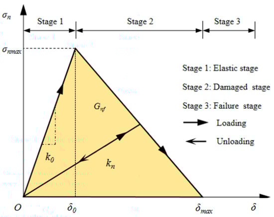 In the Figure 2, σn represents the normal cohesive forces, σmax represents the maximum normal cohesive forces, k0 represents the normal initial stiffness, kn initial unloading stiffness, Gnf represents the normal fracture energy, δmax represents the normal critical separation, δ0 represents the normal opening displacement.