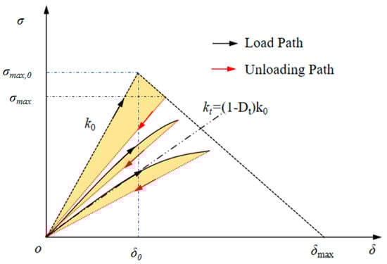 According to the relationship in Figure 3, the initial cohesive strength parameter σmax was used to establish the constitutive relationship of CZM for cumulative damage under cyclic loading. Within this framework, the current cohesion strength is defined as: