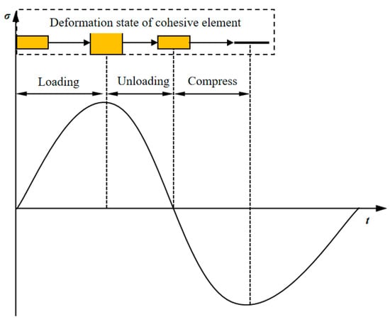 Under fatigue loading, the working states of cohesive force elements include four types: loading, unloading, contact, and compression, as shown in Figure 4. Here, “contact” refers to the condition where the cohesive force element undergoes complete damage after a certain number of cycles, and consequently, the cohesive force element no longer functions, leading neighboring elements to transition into a state of pure contact.