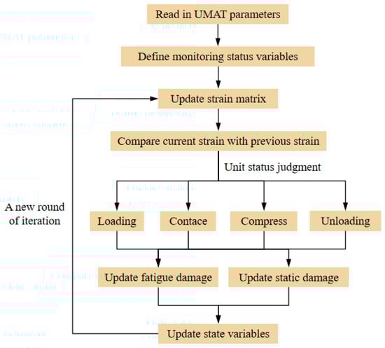 The UMAT subroutine is a FORTRAN program interface provided by the Abaqus computational software (2020) to allow users to customize material properties. Using the UMAT subroutine, users can define material constitutive relationships according to their requirements, thus enabling the computation of user-defined materials. Based on the cohesive force element damage constitutive model in Section 2.1, a UMAT subroutine is developed. Subsequently, by importing the developed UMAT subroutine into the Abaqus software, the cohesive force fatigue damage element model is completed. The compilation process of the UMAT subroutine for the cohesive force fatigue damage element model is illustrated in Figure 5.