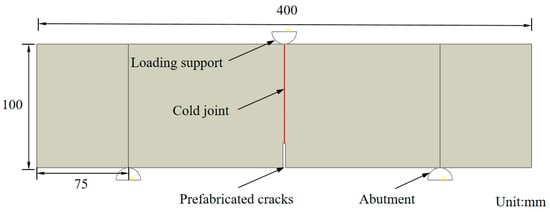 The researchers in this study conducted numerical simulations of concrete components with cold joints under monotonic loading [29]. When simulating the three-point bending fracture of components with cold joints under monotonic loading, the distribution of aggregates and mortar in the concrete was considered. Previous research findings indicated that the strength of the cold joint interface is much lower than that of the mortar-concrete interface and the mortar-aggregate interface. However, the focus of this study is on the damage and fracture behavior of components with cold joints under low-stress and low-stress amplitude fatigue loading. The loads applied to the components are much smaller than those in monotonic loading, so there is no need to consider the damage and fracture issues of the mortar interface and the mortar-aggregate interface. To improve computational efficiency, the numerical model in this study does not consider the distribution of aggregates and particles in the concrete component model, as shown in Figure 6.