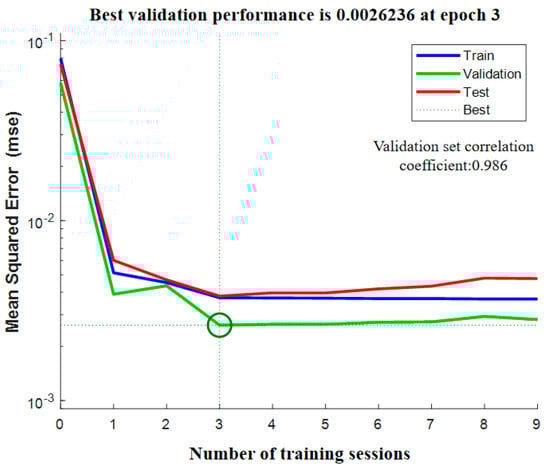 Figure 8 illustrates the relationship curve between the number of training iterations and the training mean square error of the neural network. It is evident that during the third training iteration, the mean square error of the validation set reached the minimum value of 0.0026236, with an accuracy of the validation set reaching 0.986. The corresponding relationship function at this point is selected as the hidden layer function of the neural network. After constructing the corresponding BP neural network, the experimentally obtained fatigue life and initial normal strength are input into the neural network, and the fatigue damage parameters corresponding to different pouring interval cold joints are inversely calculated, as presented in Table 1.