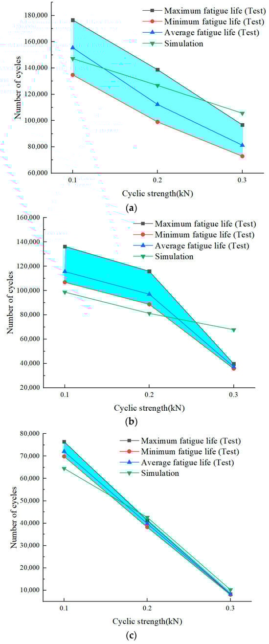 Changes in fatigue life with cyclic strength. (a) 2 h. (b) 4 h. (c) 8 h.