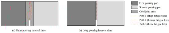 - As the casting interval increases, the area enclosed by the polygon formed by the maximum and minimum cycle counts gradually decreases, indicating a reduction in the dispersion of component fatigue life with increasing casting interval. Combined with nanoindentation experimental results, when the casting interval is short, the hydration between the first and subsequent castings is very strong. As a result, the interface strength is high and the thickness is large, leading to a high degree of randomness in the crack propagation path under fatigue loading, thus resulting in a large dispersion of fatigue life, as shown in Figure 10a. With increasing casting interval, the hydration at the surface of the first casting gradually diminishes, resulting in weaker and thinner interface regions. Consequently, the randomness of crack propagation paths decreases, leading to a smaller dispersion of fatigue life, as illustrated in Figure 10b [18]. The influence of cold joint interface thickness on fatigue damage and life dispersion was not considered in the numerical simulation. Hence, the fatigue life is a deterministic value. Further research can be conducted in subsequent work to investigate the effect of cold joint interface thickness on cold joint fatigue damage and life dispersion.