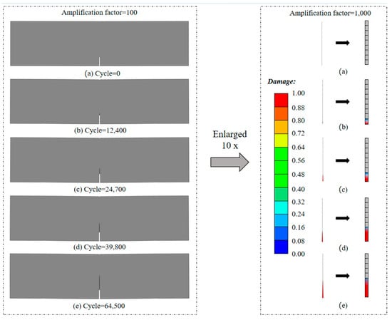 Cold joint interface elements first suffer damage near the pre-existing cracks. With the increase in the number of fatigue loading cycles, the damage value of cohesive elements gradually increases to 1. At this point, the cohesive elements completely fail and macroscopic cracks occur. When the cracks extend to a certain extent, the component reaches its fatigue life and cannot withstand the load anymore.