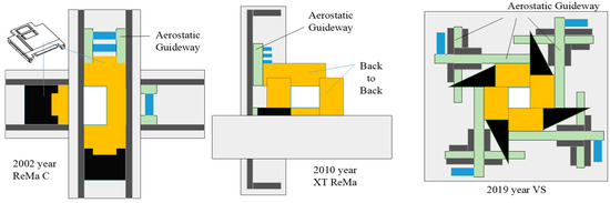 Air bearings have the advantages of high accuracy, fast speed, and low friction, and have been widely used in premium wares such as ultra-precision measurement and sophisticated manufacturing [1,2]. Recently, many scholars have been paying attention to relevant developments, because air bearings have become an irreplaceable core component in reticle masking and exposure systems to improve efficiency and accuracy for photolithography machines [3,4,5]. As shown in Figure 1, no matter how the lens diaphragm has been upgraded in the past 20 years, without exception, air bearings have perfectly adapted to the increasing scanning speed and acceleration, with the accuracy becoming higher and the structure becoming more integrated [6,7,8].