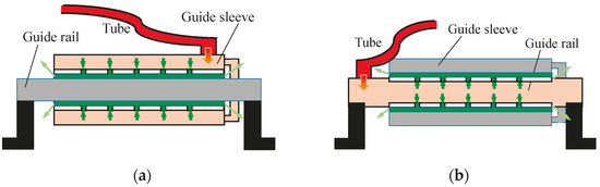 Working principle of guideway. (a) Air tube on guide sleeve. (b) Air tube on guide rail (The direction of the arrows are the direction of the airflow).