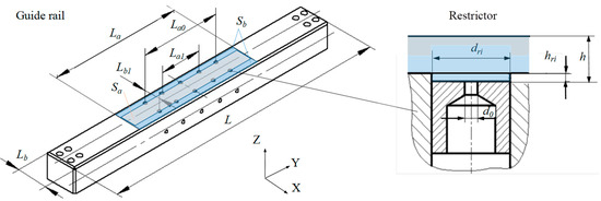 Compared with the traditional air bearing, the compound restrictor type has greater stiffness. But its microstructure is complex, and it also has stricter requirements for operating conditions and shape errors [9,10,11]. In recent years, the gradual development of micro-fabrication technology has provided underlying support for the innovation and application of compound restrictor air bearings [12,13,14,15,16]. Especially in the field of ultra-precision measurement and manufacturing, guideway structure miniaturization and performance optimization have become increasingly necessary and urgent [17,18].