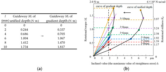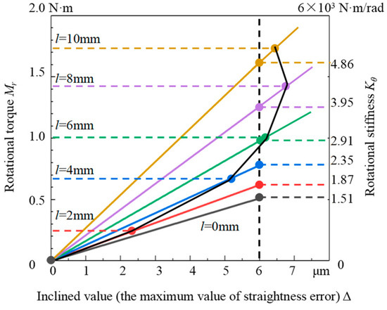 When the guide sleeve moves along the y-direction, the asymmetry of the restrictors’ position will lead to the asymmetry of pressure distribution, as shown in Table 1. Due to the pressure homogenization effect [21,22], the bearing capacity W hardly changes unless it exceeds the range of Lcmax. But the rotational torque Mr continues to increase as the eccentricity value increases. The air film itself has a certain degree of stiffness and rotational stiffness, which can offset the rotational torque. But the cost is that the air film must produce spontaneous tilting, which is not desirable because it will reduce the straight motion accuracy [23]. We calculate the rotational stiffness of the air film at different moving distances l, which shows an inverse effect on the theoretical straightness error caused by rotational torque Mr, shown in Figure 4.