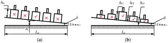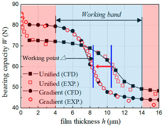 In order to improve the rotational stiffness, the recesses’ depths were set to the gradient, as shown in Figure 5b. The depths of hri are set to match the local film thickness h. This method has been experimentally validated by our previous research in ref. [3].